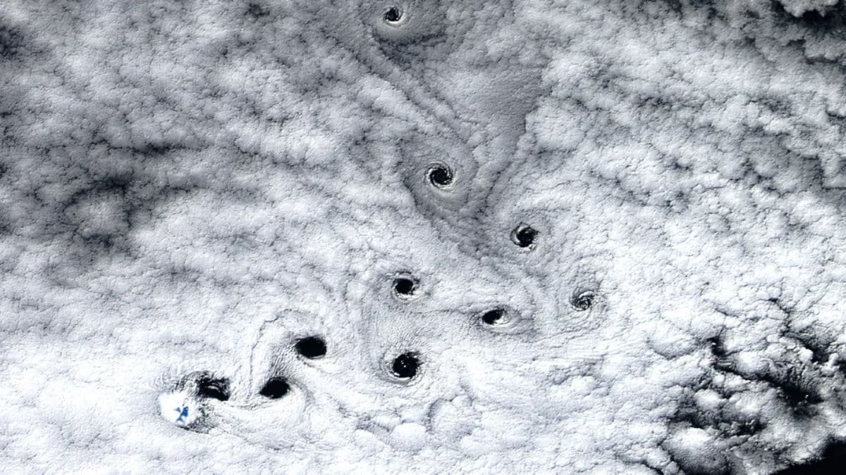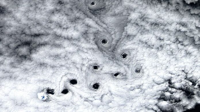 Now, a stunning new image captures these 10 twisting “dark voids” above 2 miles above the southern Indian Ocean, about 1,500 kilometers north of Antarctica. The event is a consequence of abnormal atmospheric events, creating clearly delineated black holes in cloud formations. With a width of about 13 kilometers the dark spots — signifying areas where winds are prevailing — formed as the presence of Mawson Peak, a 2.7 kilometer high volcano at island´s summit, distorted those in their path into an unusual spiral shape seldom visualised with such intensity and complexity.