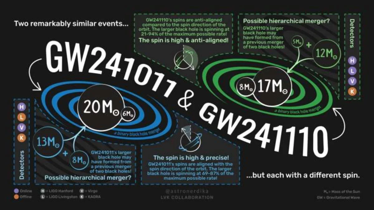 According to a paper published in The Astrophysical Journal Letters, in GW241011 (Oct 2024), LIGO-Virgo-KAGRA detectors observed a merger of black holes with masses around 17 and 7 times the Sun’s mass, with the larger one spinning extremely fast. In November 2024, the detectors saw GW241110, the merger of black holes of about 16 and 8 solar masses. Remarkably, in this case, one black hole’s spin was tilted opposite its orbit—a first-of-its-kind observation.