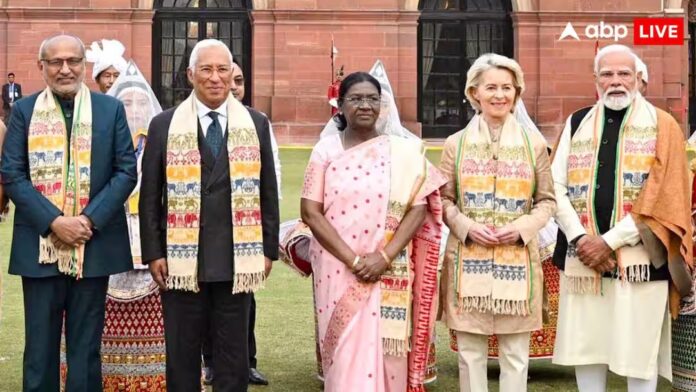 राष्ट्रपति कार्यालय ने एक्स पर एक पोस्ट में बताया कि गणतंत्र दिवस समारोह के मुख्य अतिथि, यूरोपीय परिषद के अध्यक्ष एंटोनियो कोस्टा और यूरोपीय आयोग की अध्यक्ष उर्सुला वॉन डेर लेयेन ने स्वागत समारोह में भाग लिया. उपराष्ट्रपति सी पी राधाकृष्णन, प्रधानमंत्री नरेन्द्र मोदी, पूर्व राष्ट्रपति रामनाथ कोविंद, प्रधान न्यायाधीश सूर्यकांत, लोकसभा अध्यक्ष ओम बिरला, केंद्रीय मंत्री, राज्यसभा में विपक्ष के नेता मल्लिकार्जुन खरगे और लोकसभा में विपक्ष के नेता राहुल गांधी भी समारोह में शामिल हुए.