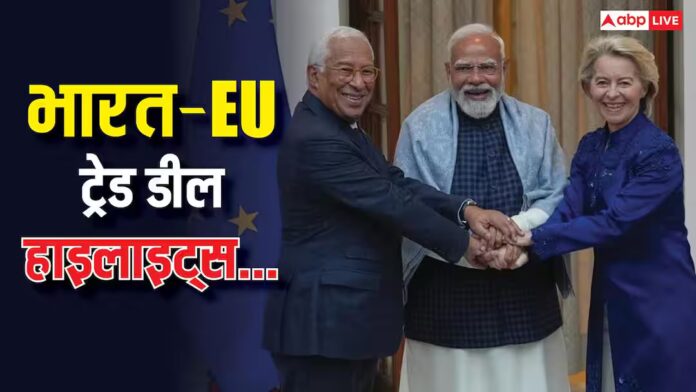 27 जनवरी 2026 को दिल्ली के हैदराबाद हाउस में प्रधानमंत्री नरेंद्र मोदी ने यूरोपीय यूनियन (EU) कमीशन प्रेसिडेंट उर्सुला वॉन डेर लेयेन और यूरोपीय काउंसिल प्रेसिडेंट एंटोनियो कोस्टा के साथ मीटिंग की. भारत और यूरोपीय यूनियन के नेताओं ने 16वें भारत-EU समिट के दौरान भारत-EU के बीच सबसे बड़ा फ्री ट्रेड एग्रीमेंट (FTA) समझौता किया. इस समझौते की 10 बड़ी बातें जानते हैं…