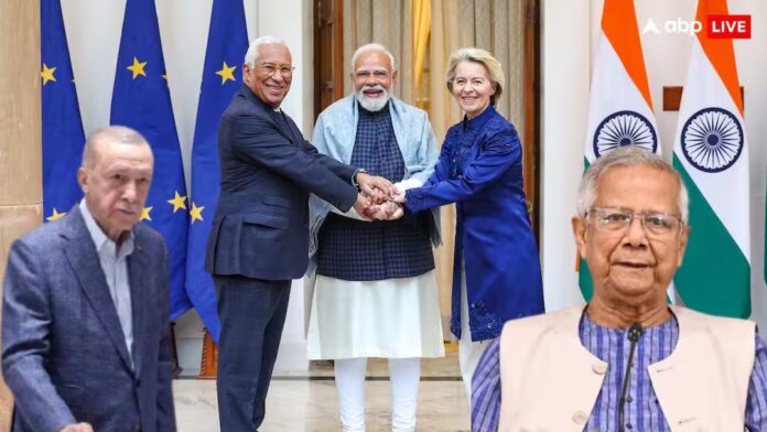 भारत और यूरोपीय संघ के बीच हुए मुक्त व्यापार समझौते (FTA) की चर्चा दुनियाभर में है. EU के साथ एफटीए में भारतीय निर्यात को प्राथमिकता मिलना एक गेम चेंजर है. इस डील से देश के लिए 75 अरब डॉलर (6.41 लाख करोड़ रुपये) के निर्यात के अवसर खुले हैं, जिसमें कपड़ा, चमड़ा, समुद्री उत्पाद, ज्वैलरी जैसे श्रम-प्रधान क्षेत्रों में 33 अरब डॉलर के निर्यात को एफटीए के तहत प्राथमिकता मिलने से भारी लाभ होने वाला है. भारत-यूरोपीय यूनियन के इस कदम ने तुर्किए और बांग्लादेश की निंद उड़ा दी है.