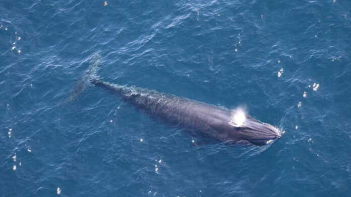 In this 2024 image provided by U.S. NOAA Fisheries, a Rice’s whale is visible from onboard the NOAA Twin Otter aircraft off the coast of Texas in the Gulf of Mexico.